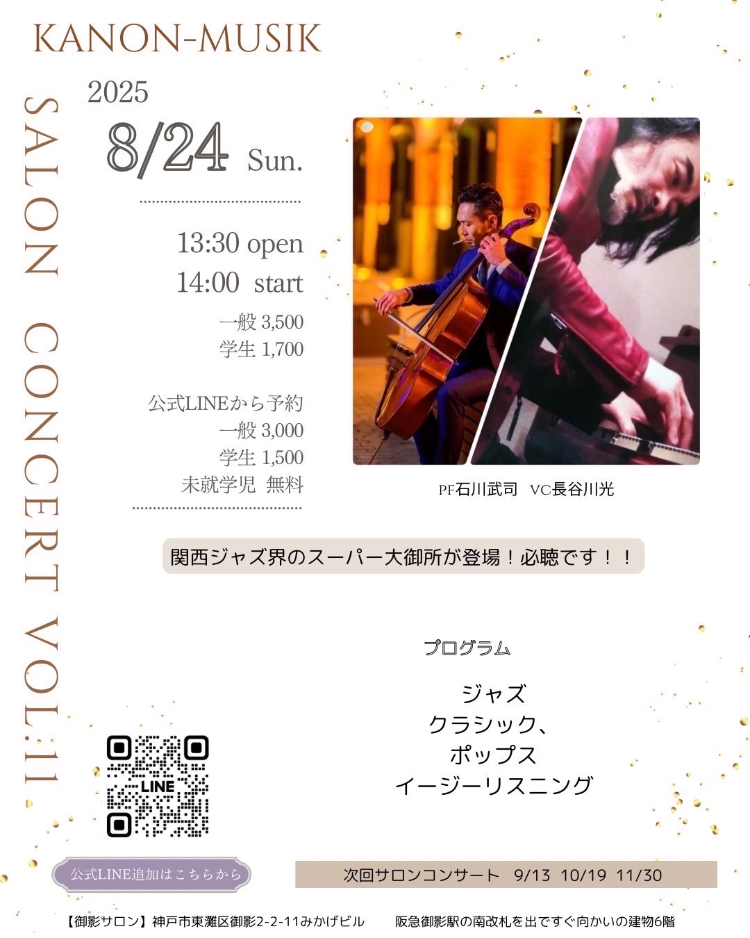 「みかげサロン / 8月24日」 投稿日 2025年8月19日 著者 admin カテゴリー 3~5歳 カテゴリー アンサンブル カテゴリー グループレッスン カテゴリー コントラバス カテゴリー コース カテゴリー ビオラ カテゴリー ピアノ カテゴリー ブログ カテゴリー ヴァイオリン カテゴリー 中学生~大学生 カテゴリー 中学生~大学生 Expert カテゴリー 大人 カテゴリー 小学生 カテゴリー 小学生 Expert カテゴリー 教室ブログ カテゴリー 管楽器 今月2回目のサロンコンサート。 ジャズピアノ界の重鎮・石川武司さんをお迎えしてベースではなくチェロとのデュオ。 プログラムは、専門のジャズはもちろん、新しいユニットの試みとしてアレンジを施し、よく耳にする作品や映画音楽などを取りそろえてお送りします。 夏の午後のひととき、心地よいサウンドに身を委ねてみませんか💓 爽やかな健康ドリンクも用意してお待ちしています。