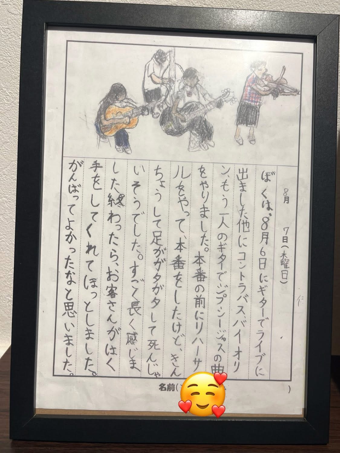 「夏休み日記帳」 投稿日 2025年8月30日 著者 admin カテゴリー 3~5歳 カテゴリー アンサンブル カテゴリー グループレッスン カテゴリー コントラバス カテゴリー コース カテゴリー ビオラ カテゴリー ピアノ カテゴリー ブログ カテゴリー ヴァイオリン カテゴリー 中学生~大学生 カテゴリー 中学生~大学生 Expert カテゴリー 大人 カテゴリー 小学生 カテゴリー 小学生 Expert カテゴリー 教室ブログ カテゴリー 管楽器 二学期が始まります~! まだまだ暑い毎日ですが夏休みの思い出がそれぞれの心に残っていることでしょう。 小2のC君は、ギターでとても貴重な経験が出来ました。 みかげサロンでもその成果を披露しましたが、ギターの巨匠チャボロさんが来日中にセッション出来るチャンスがあり、夜遅かったのですがお父さんに連れられて大阪のライブハウスにやって来ました。 そこで一緒に演奏できた幸せな時間はC君の一生の思い出に残る夢のような出来事だったと思います。 夏休みの日記帳に丁寧に書いてくれた絵が物語っていますね。