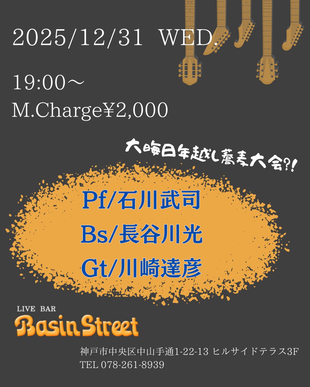 【演奏情報】2025.12.31(水) 投稿日 2025年11月23日 著者 admin カテゴリー お知らせ カテゴリー ブログ カノンムジークで活動するアーティストのコンサート案内です 日時 2025年12月31日(水) 19:00~ 会場 Basin Street MC: ¥2,000 Pf.石川武司 Kb.長谷川光 Gt.川崎達彦