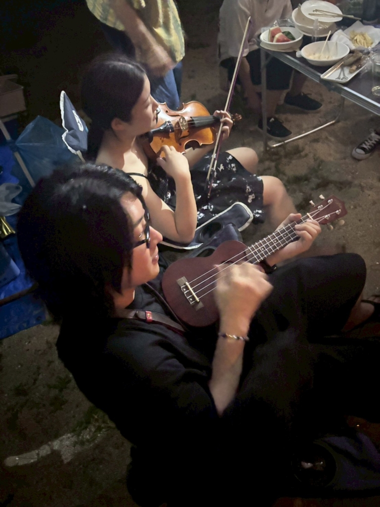 持ち込んだ楽器で俄か合奏団。