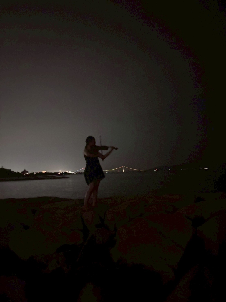 日が暮れると遠くに見える明石海峡大橋に輝くイルミネーションがレインボーになったり赤く染まったり。