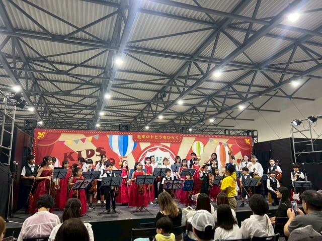開演前にスタンバイしたらMCのお兄さんから質問「それは、何という名前の楽器なの?」「大きな楽器だね~」「みんなで練習どのくらいしたの?」「お揃いのリボンの色あい良いね!青と緑は何か理由あるの?」などなど機知に富んだ質問をしてくださるのでみんなテンションがアップ👌それに続いて演奏が勢いよく始まりました。