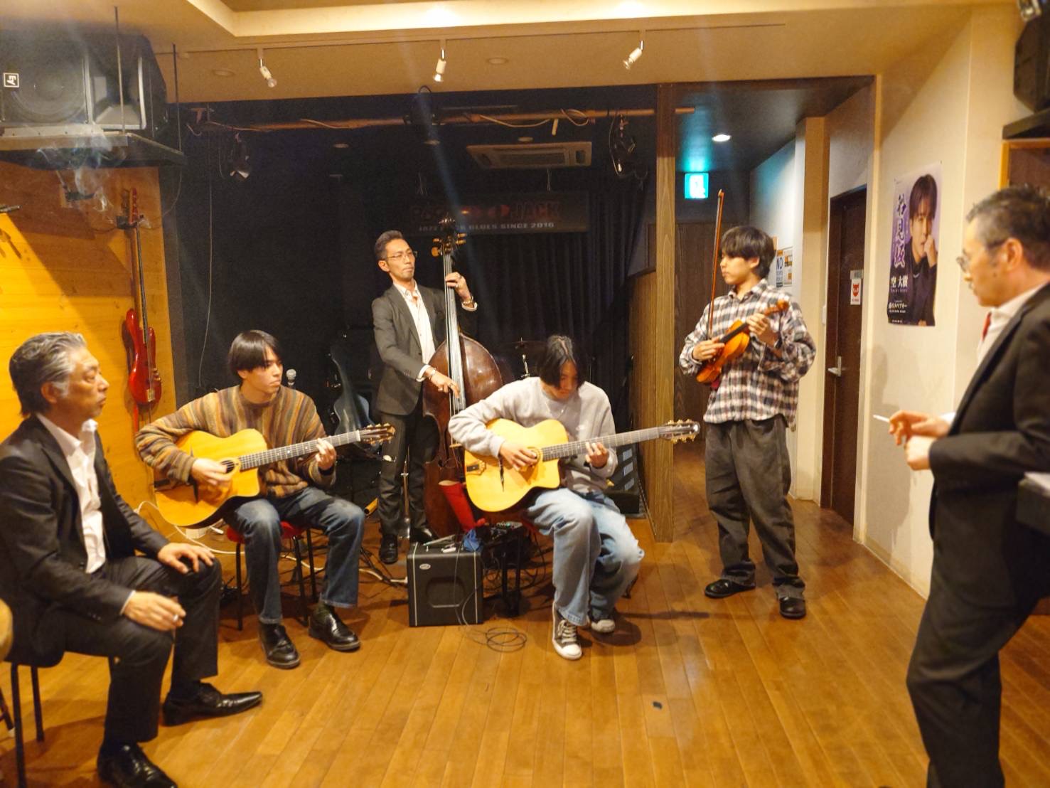 「トリオ宇和島Live 大盛況で終わりました。 昨日は松山からの大学生4人組。昨年からジプシージャズをやり始めていて、トリオライブの情報を見つけ来てくれました。演奏後のセッションでは山本さんと友利さんの🎸を借りて光さんと一緒に演奏。バイオリンの彼は子どもの頃からクラシック、高校でジャズ、大学になってジプシージャズに出会ったそうです。最高峰の演奏を聴いた後に演奏のアドバイスをもらい、一緒にセッション。すごく良い経験になったことでしょう!」