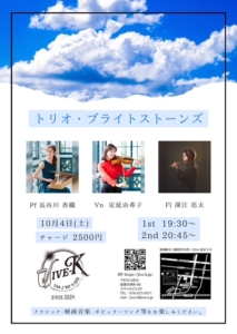 【演奏情報】2025.10.18(土) 投稿日 2025年9月27日 著者 admin カテゴリー お知らせ カテゴリー ブログ カノンムジークで活動するアーティストのコンサート案内です 日時 2025年10月18日(土) 15:00~ 会場 アートホール ティンプレ MC: ¥3,000 【友利の音楽会 #3】 Gt 友利竹雄 Gt 山本佳史 Kb 長谷川光